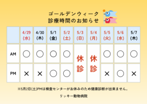 ゴールデンウィーク中は診療時間が変則しますので、お間違えのないようにお越しください。